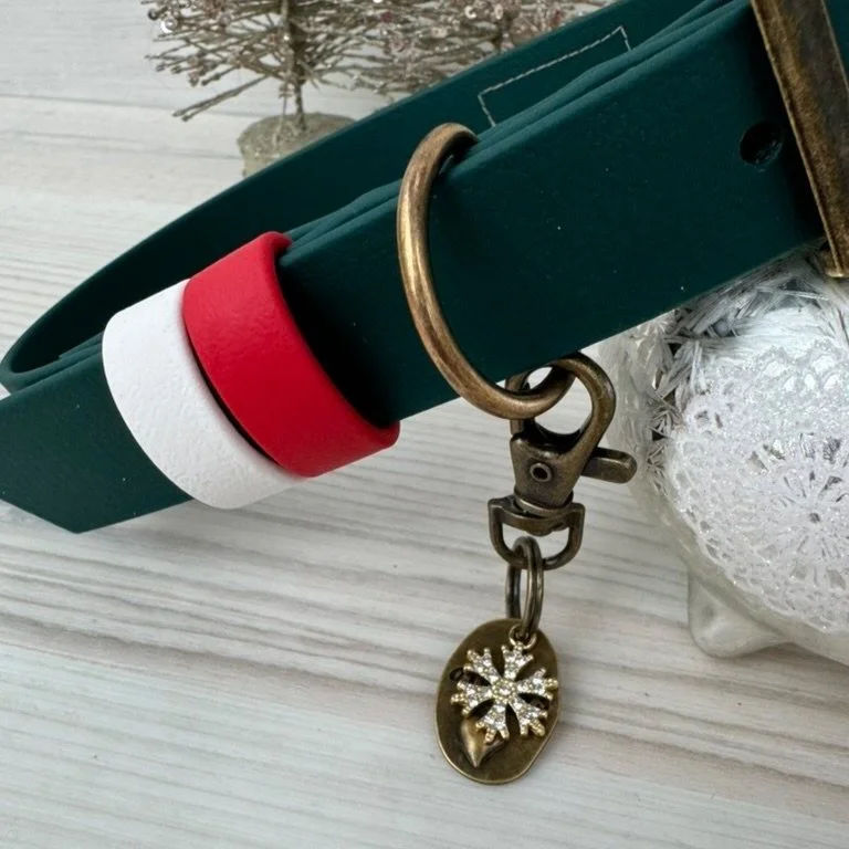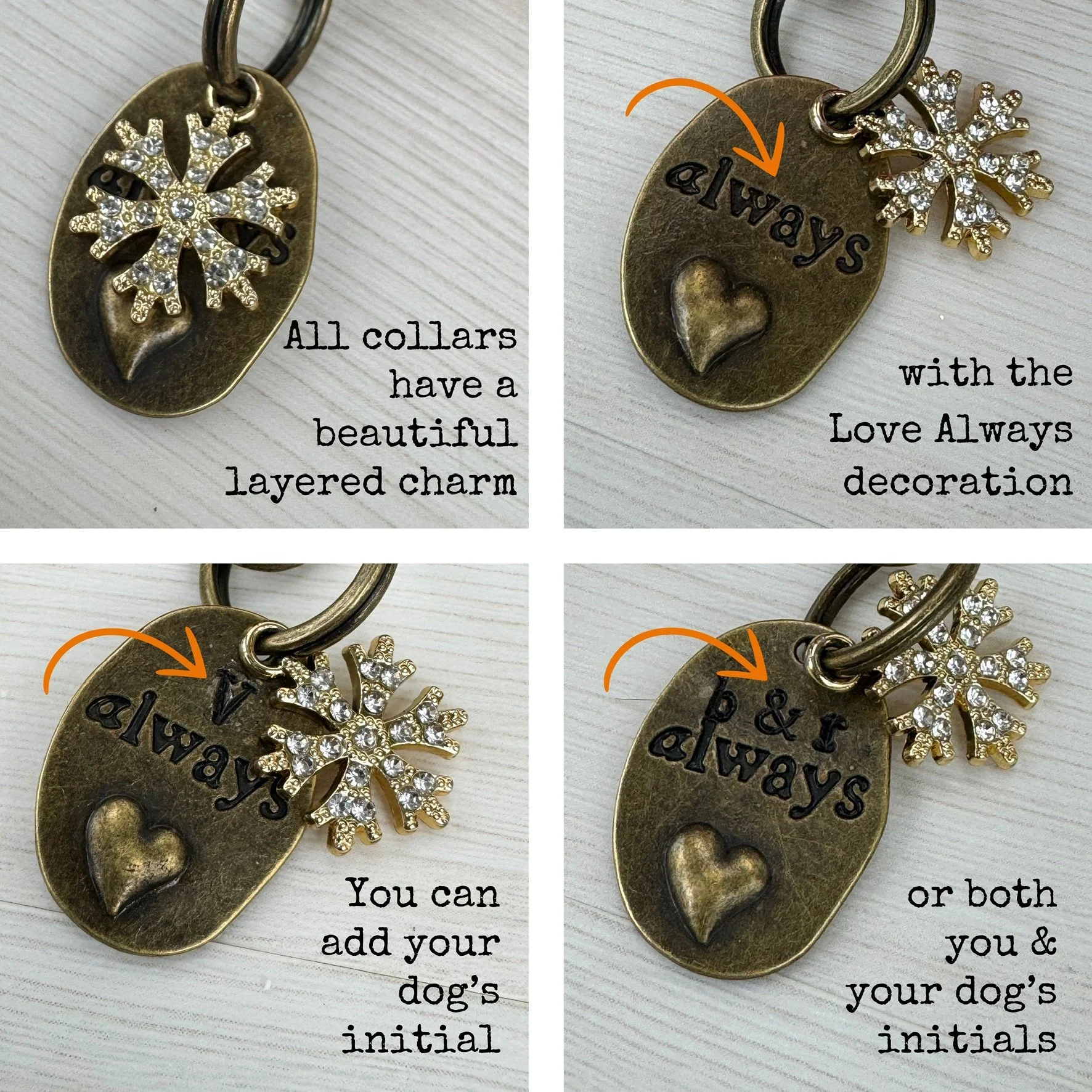 Each collar comes with a beautiful hand-stamped tag - the 25mm disc can be stamped with initial with mountains or trees, or up to 3 words (please note we cannot put all ID info on these – see our 2mm thick solid brass ID tags for this).